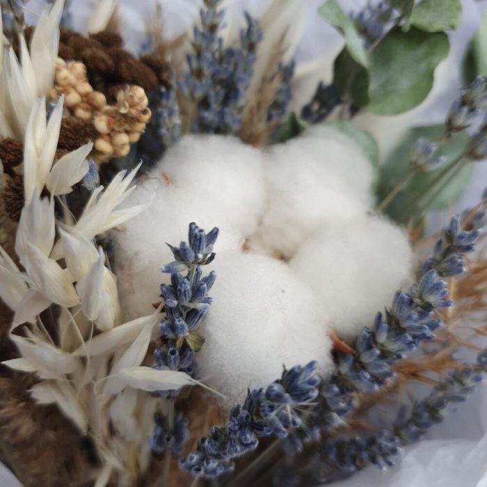 Танацетум – 1 шт.Упаковка дизайнерская – 1 шт.Хлопок натуральный – 1 шт.Лагурус (сухоцвет) – 3 шт.Эвкалипт сухоцвет – 1 шт.овес сухоцвет – 2 шт.сорго – 1 шт.лавандин пучок – 1 шт.камыш декоративный пучок – 1 шт.