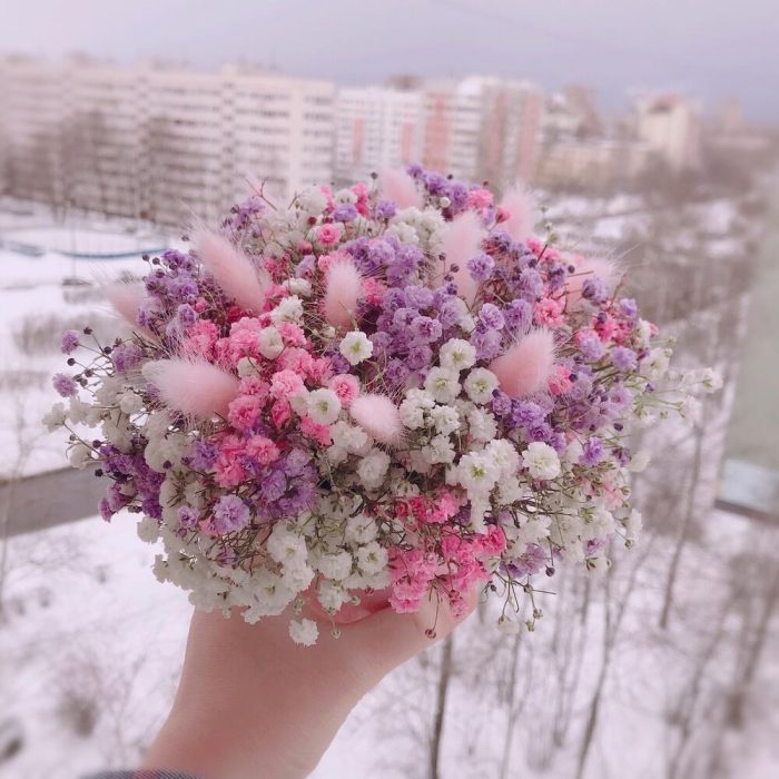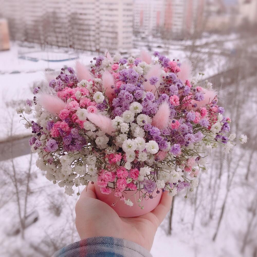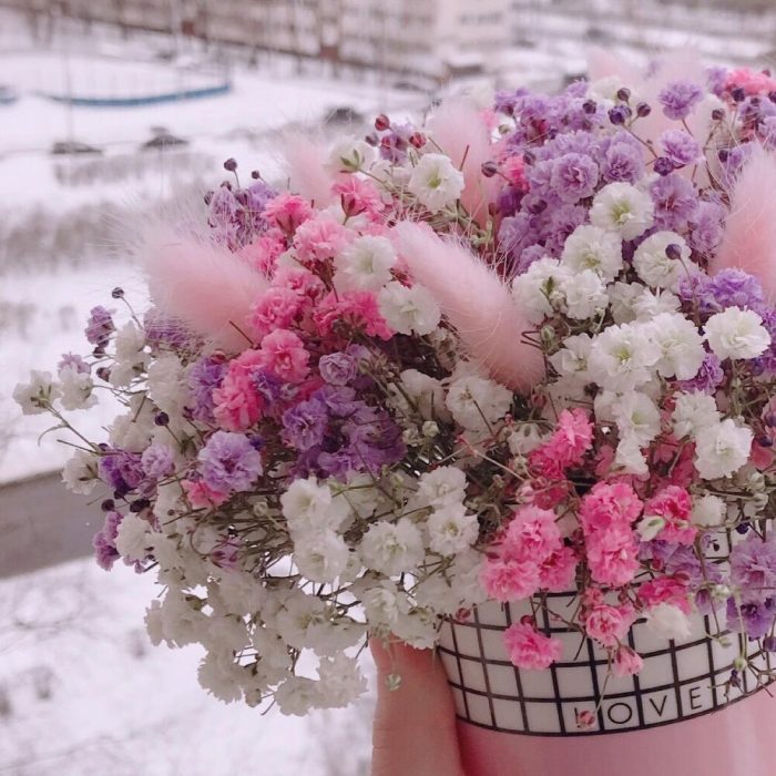 Очаровательная композиция из изысканных свежих цветов.Наполнена множеством соцветий радужной гипсофилы и пушистого лагуруса. Собрана в стильном кашпо из керамики с надписью “Love”.Композиция из гипсофилы – необычный подарок, который удивит своей невероятной стойкостью, при правильном и простом уходе.❤️ Ставить композицию в прохладном месте, избегая отопительных приборов и прямых солнечных лучей. ❤️ Подливать немного воды в серединку.Гипсофила не вянет, а становится сухоцветом, сохраняя свой вид. Поэтому композиция продолжит радовать ещё очень долго!Чтобы защитить готовый букет во время доставки от любых погодных условий, мы бережно его упаковываем