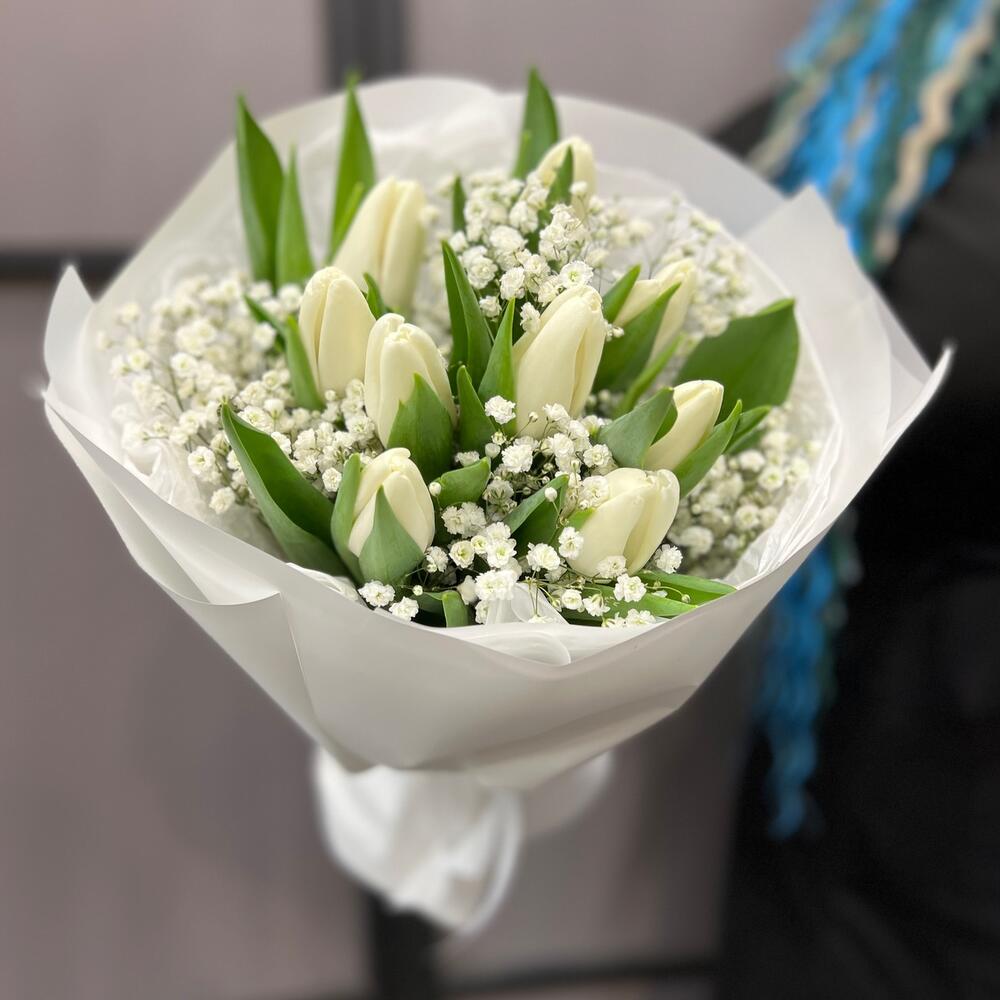 Тюльпан белый – 9 шт.Гипсофила – 2 шт.Тишью белое – 2 шт.Пленка матовая – 5 шт.Лента атласная – 2 шт.